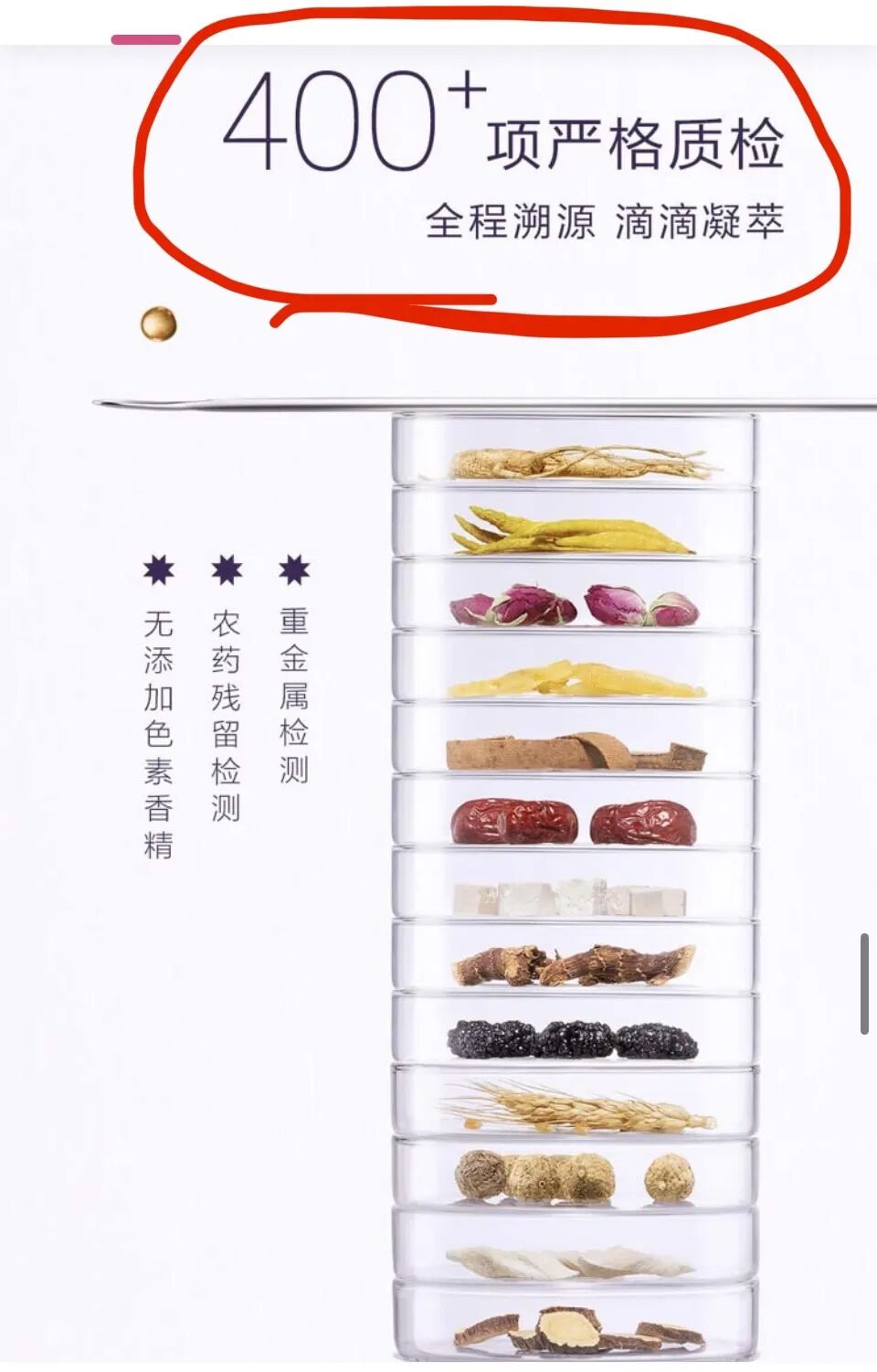 因为气血不足是很明显的,头发越来越白,手脚变干,体力精力不如年轻时候,慢性疲劳,睡眠质量下降等等等等,为啥喝这款,比起吃膏方,我不用担心重金属,农残,激素这些,刚上市就经过400多项检测,原料都来自最好的原产地,古法熬制,加现代科技萃取,高效补气血。
