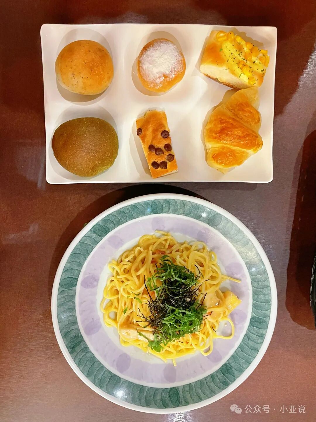 这份意面,面包是自助的,共90元人民币。