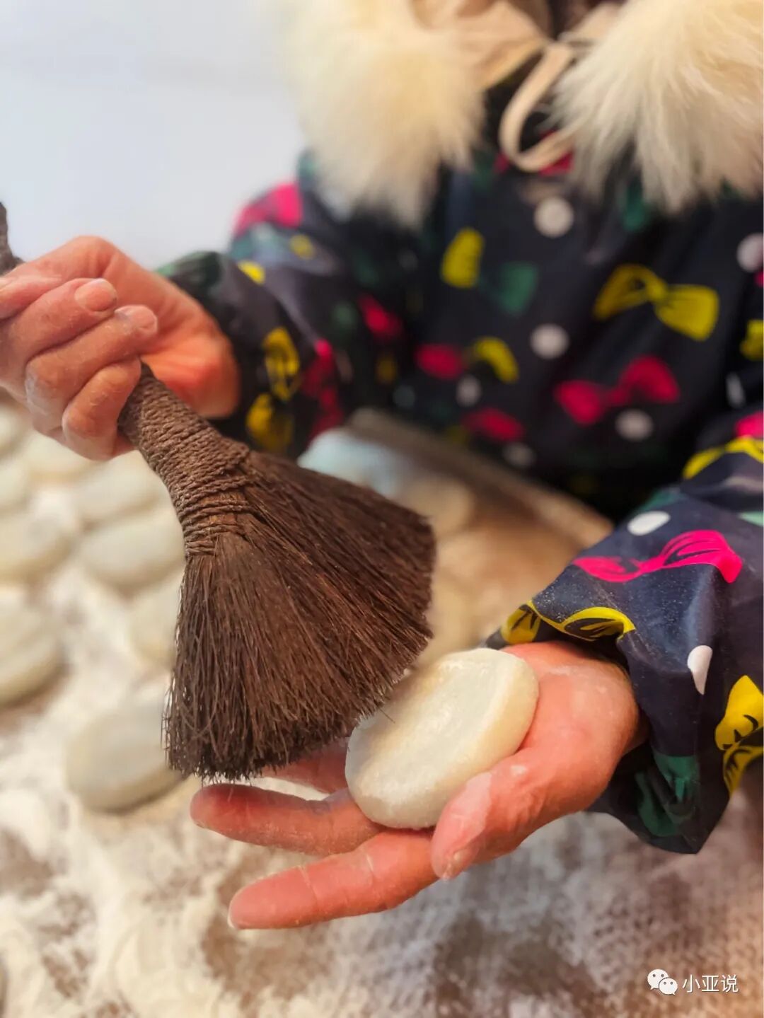 妈妈就在一边,把多余的防止粘住的米粉刷掉。