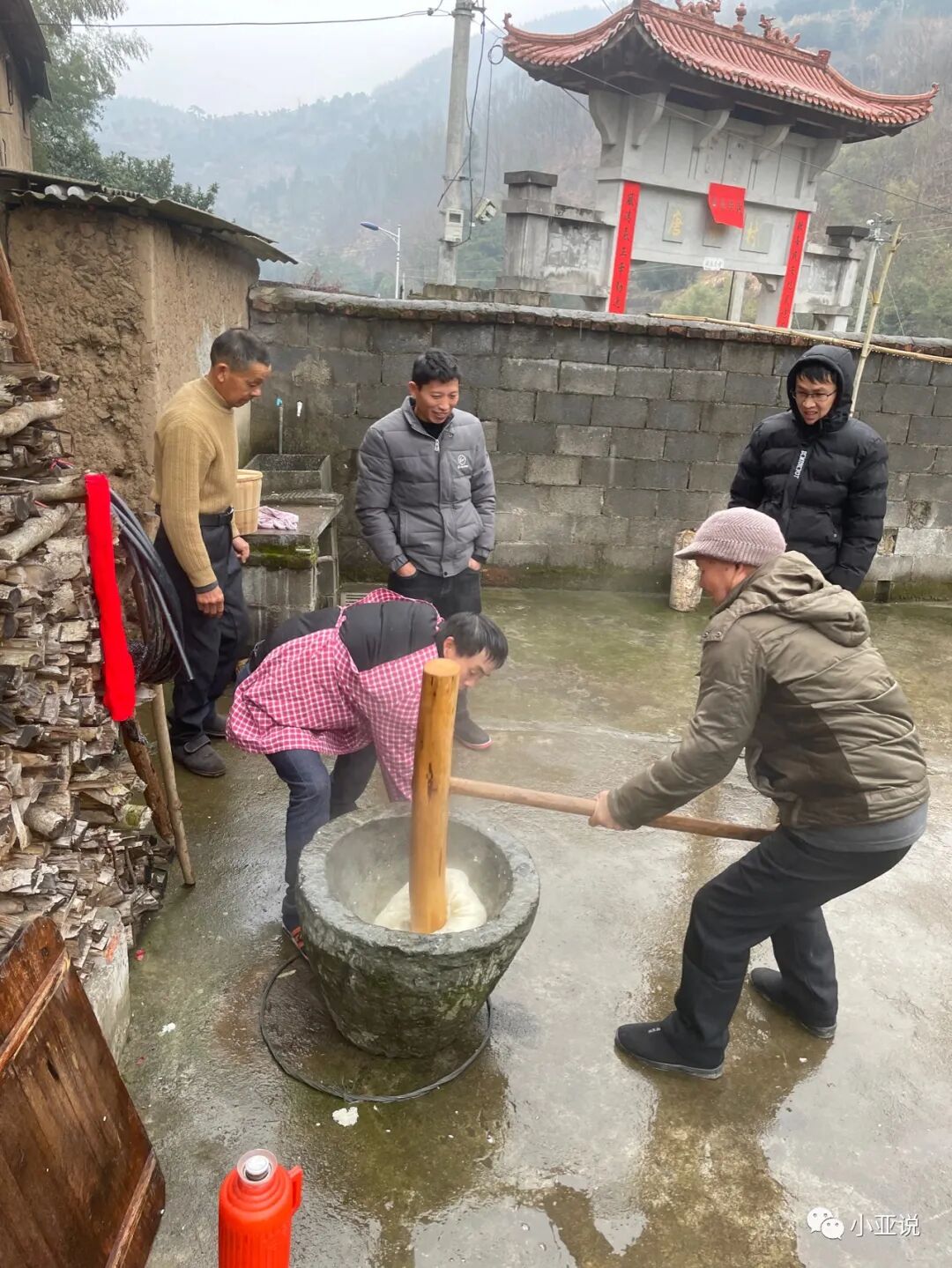 大清早,上锅蒸熟。放进石臼里,一边翻一边打,还要加适量的开水,打到软糯成团,韧性十足。看起来简单,其实,技巧十分讲究,时间,力道,火候。