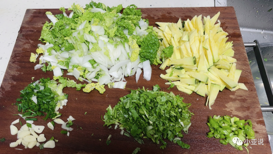 一棵青菜🥬,四分之一个嫩南瓜,葱,蒜,香菜,自己阳台上种的三个嫩辣椒,加上一块之前就做好的红烧大肉。