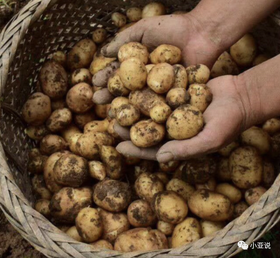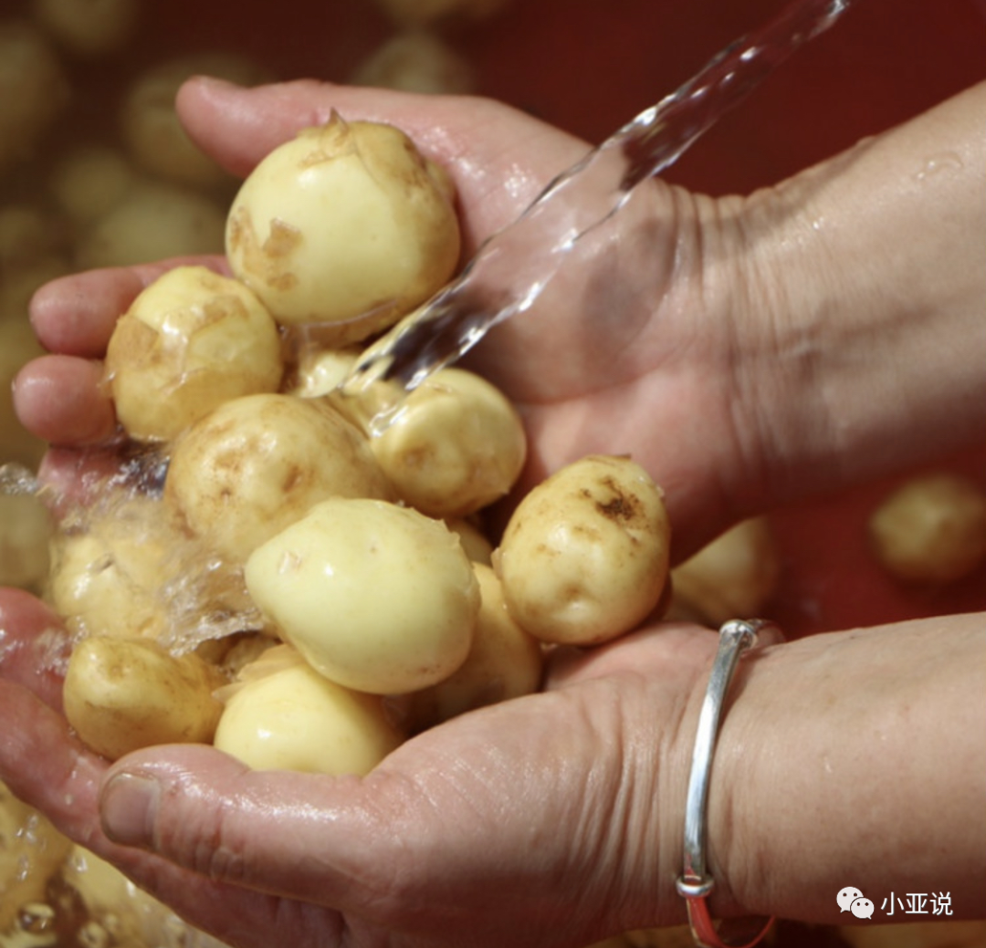 挑出三碗最小个的土豆,拿竹篮在水里用力摇,土豆皮就掀开了。