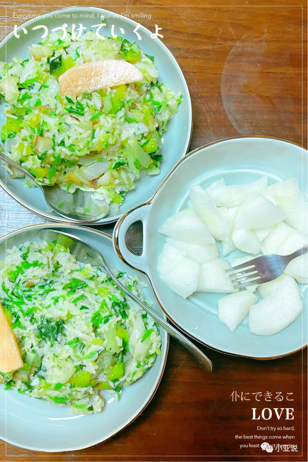 今晚做了菜饭,当然也可以称为炒饭,但油和盐都放的很少,细细品尝,能吃出食物本身的味道。