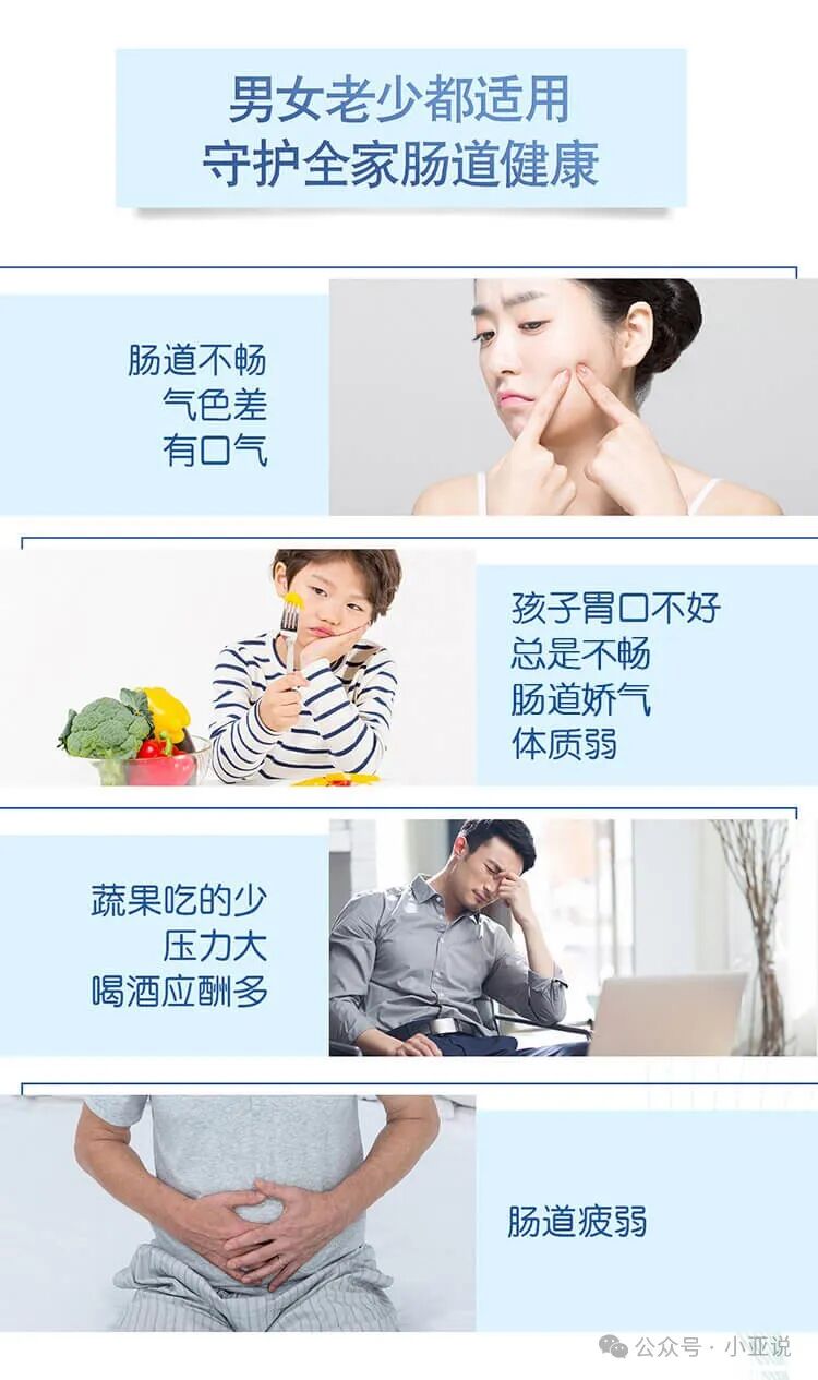 适合3岁以上的儿童、成人和老人食用,帮助您和家人重建肠道健康,远离肠道困扰。