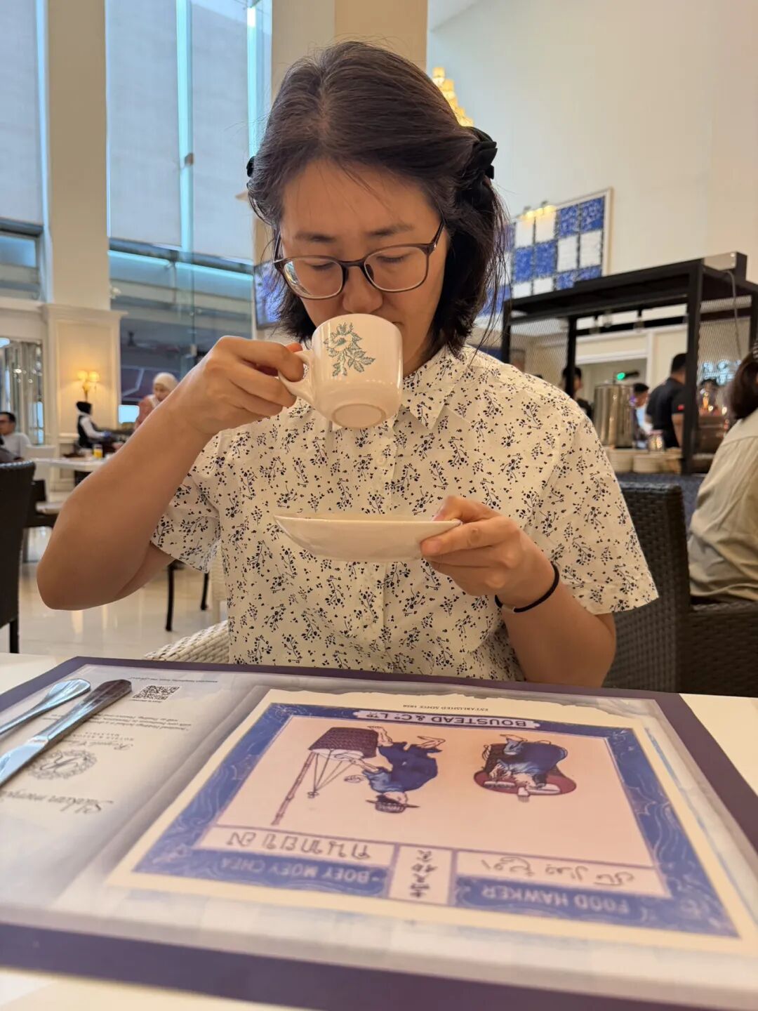 有个胖胖的女服务员,不仅打了两坨腮红,下巴和鼻子也打了红红的,一开始我以为皮肤过敏,之后才发现是打上去的,还挺好看,像西方油画里的人物,或者像寒冷地区冻成这样很可爱。
