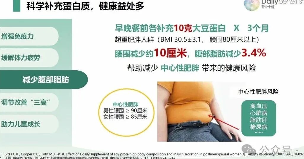 特别为了 减少腹部脂肪 , 可以在 早晚餐前各补充10克大豆蛋白