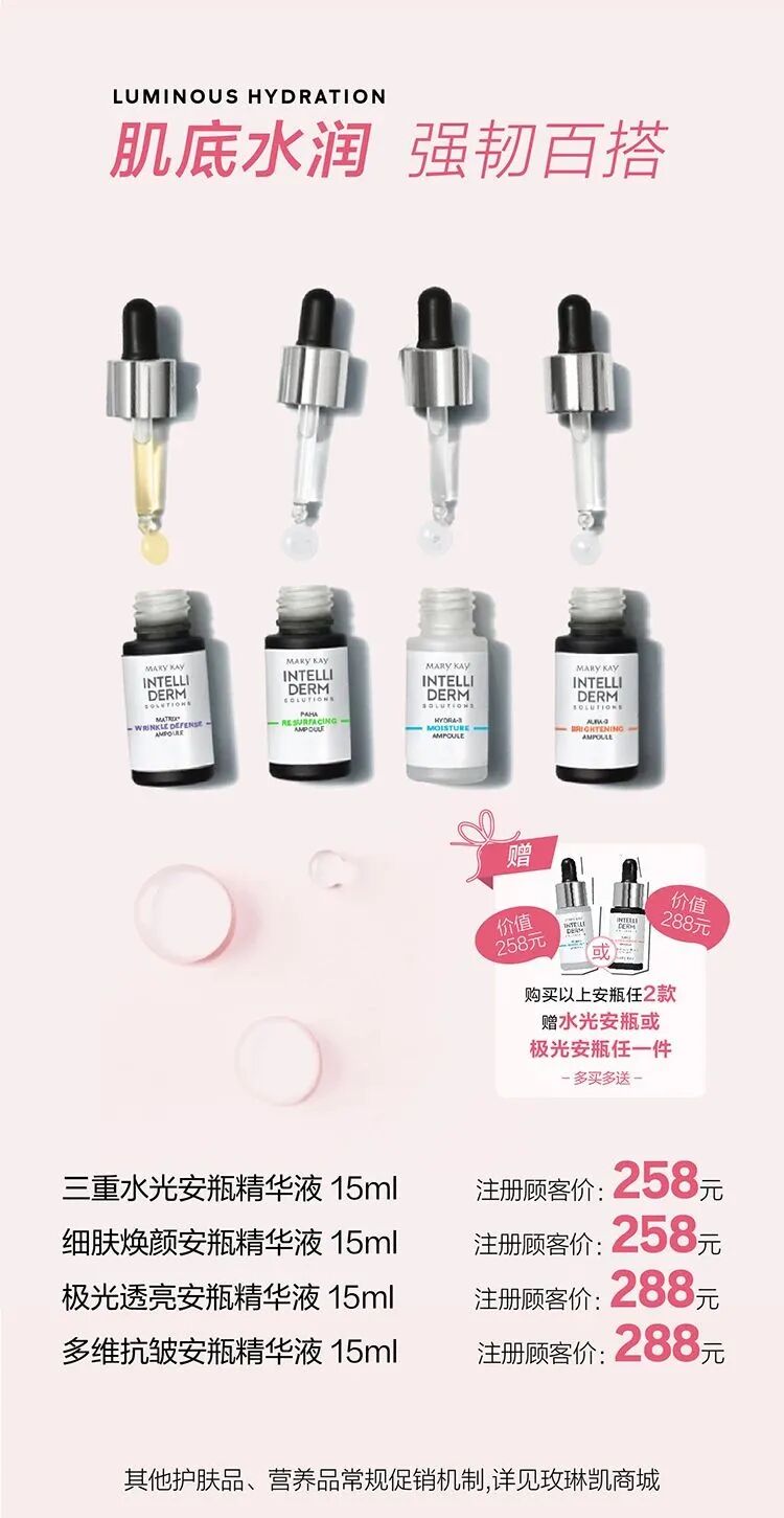 三重水光安瓶精华液 15ml (注册顾客价258元) 细肤焕颜安瓶精华液 15ml (注册顾客价258元) 极光透亮安瓶精华液 15ml (注册顾客价288元) 多维抗皱安瓶精华液 15ml (注册顾客288元)